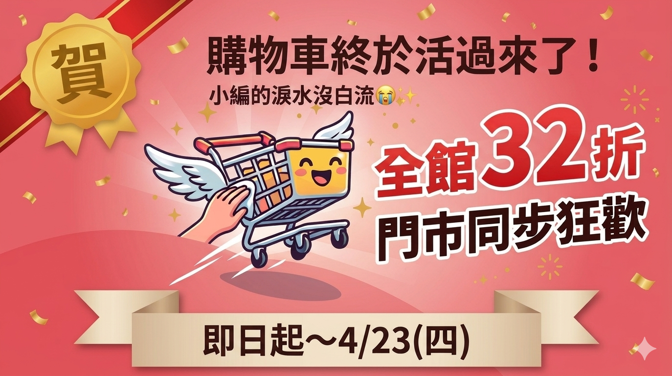 ① 全館商品 32 折:既然系統修好了,就是要讓大家買得更爽快!尊榮貴賓結帳再享 3% 回饋!