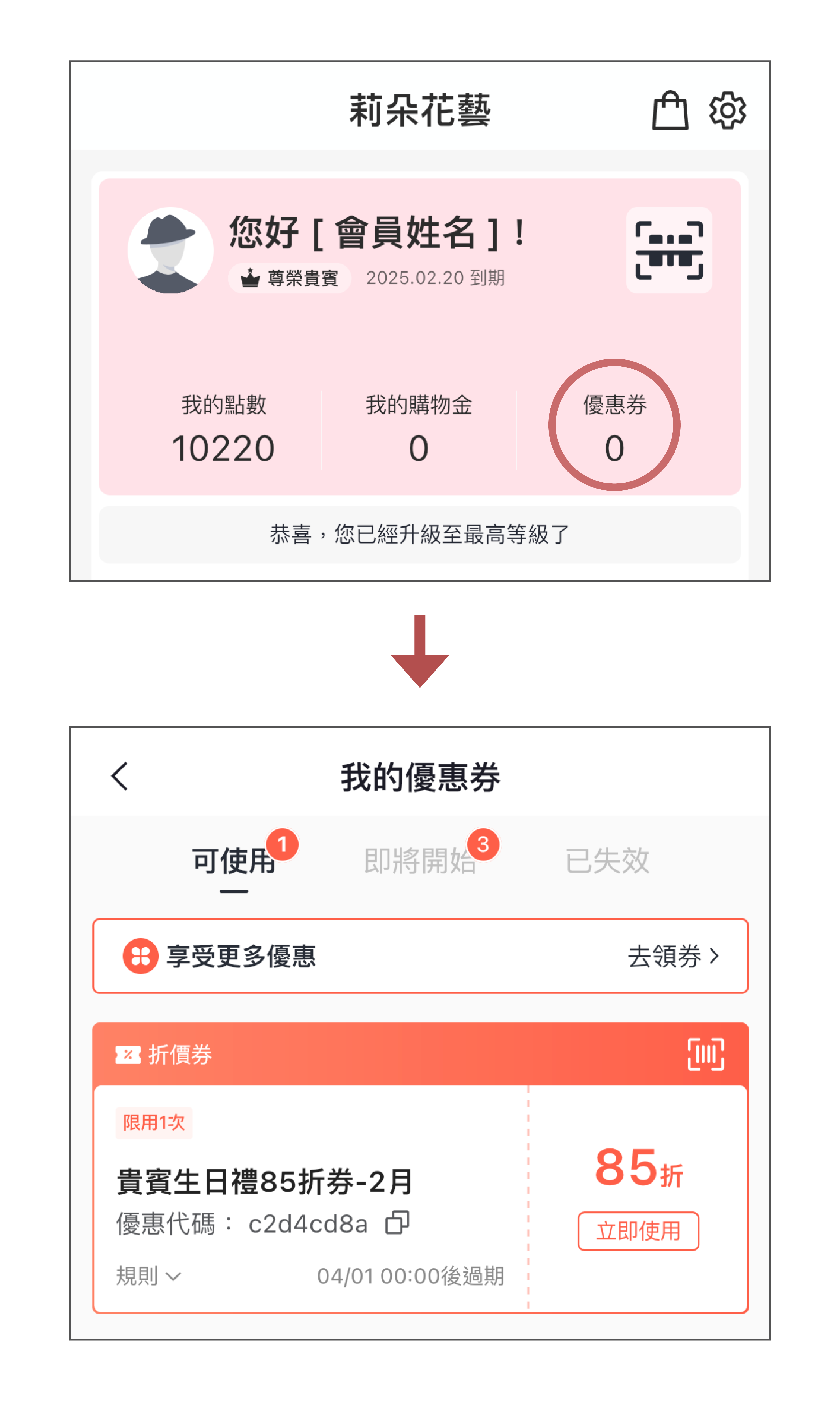 A3:型錄兌換券僅限「莉朵摯友、尊榮貴賓」可領取,貴賓生日禮僅限「尊榮貴賓」可於生日當月領取,領取流程與使用方式皆與每月購物優惠券相同。