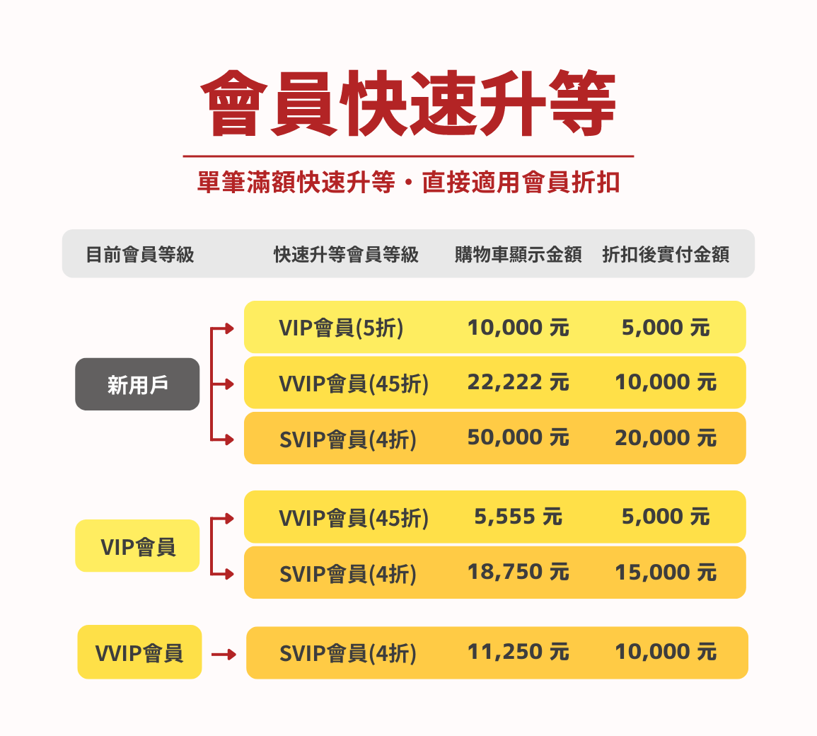 即日起於門市或線上購物,單筆結帳達到指定金額,即可快速升等會員等級,並且該筆訂單直接適用升等後會員折扣!