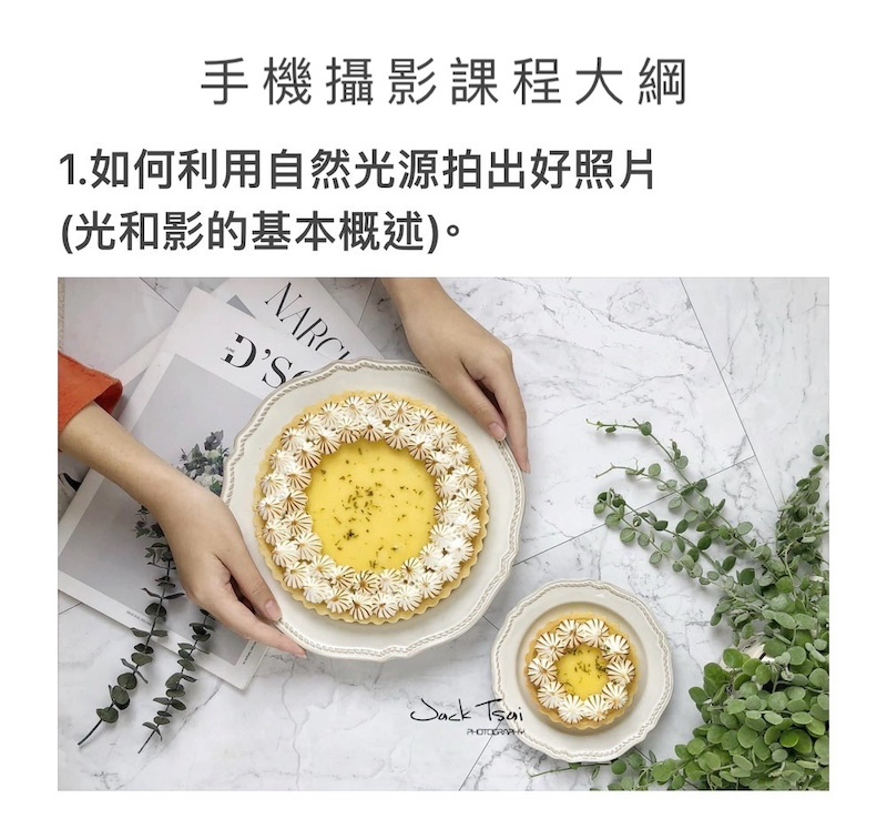課程將加強學員用光概念,使用簡易平價用品,拍出高質感專業照片。建立「到處都是攝影棚」觀念,不需迷信昂貴器材,只要用光正確,手機也能拍出高品質吸睛照片